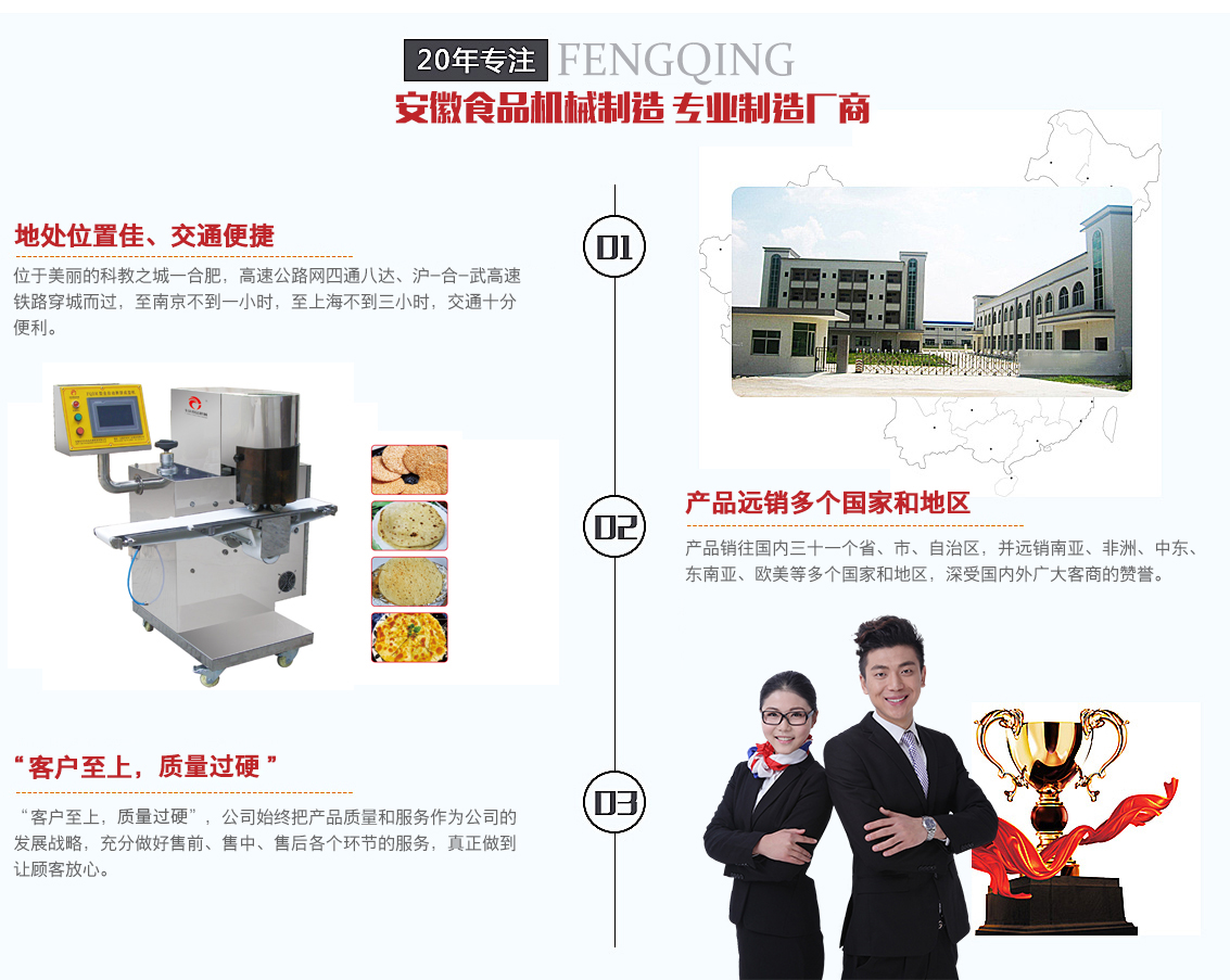 安徽豐慶食品機械制造有限公司位于美麗的科教之城—合肥,高速公路網四通八達、滬-合-武高速鐵路穿城而過,至南京不到一小時,至上海不到三小時,交通十分便利。   安徽豐慶食品機械制造有限公司是一家以面點、糕點、餅類等烘焙類食品機械的研發、生產、銷售為一體的現代化企業,產品集智能化,機電氣一體化為一身。公司匯聚一批具有豐富行業經驗的專業人才,高端項目與中國科學技術大學攜手合作,憑借先進的經營理念和技術優勢,不斷提升企業的技術水準和加工檔次,增強了企業的市場競爭力和綜合實力。過硬的產品質量和完善的售后服務使產品銷往國內三十一個省、市、自治區,并遠銷南亞、非洲、中東、東南亞、歐美等多個國家和地區,深受國內外廣大客商的贊譽。   公司秉承“誠信、團隊、服務”的經營理念,為客戶源源不斷地提供高新技術產品及優良的服務是豐...公司環境展示